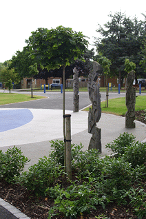 Re-design incorporating decorative resin bonded paving and existing wooden sculptures. |